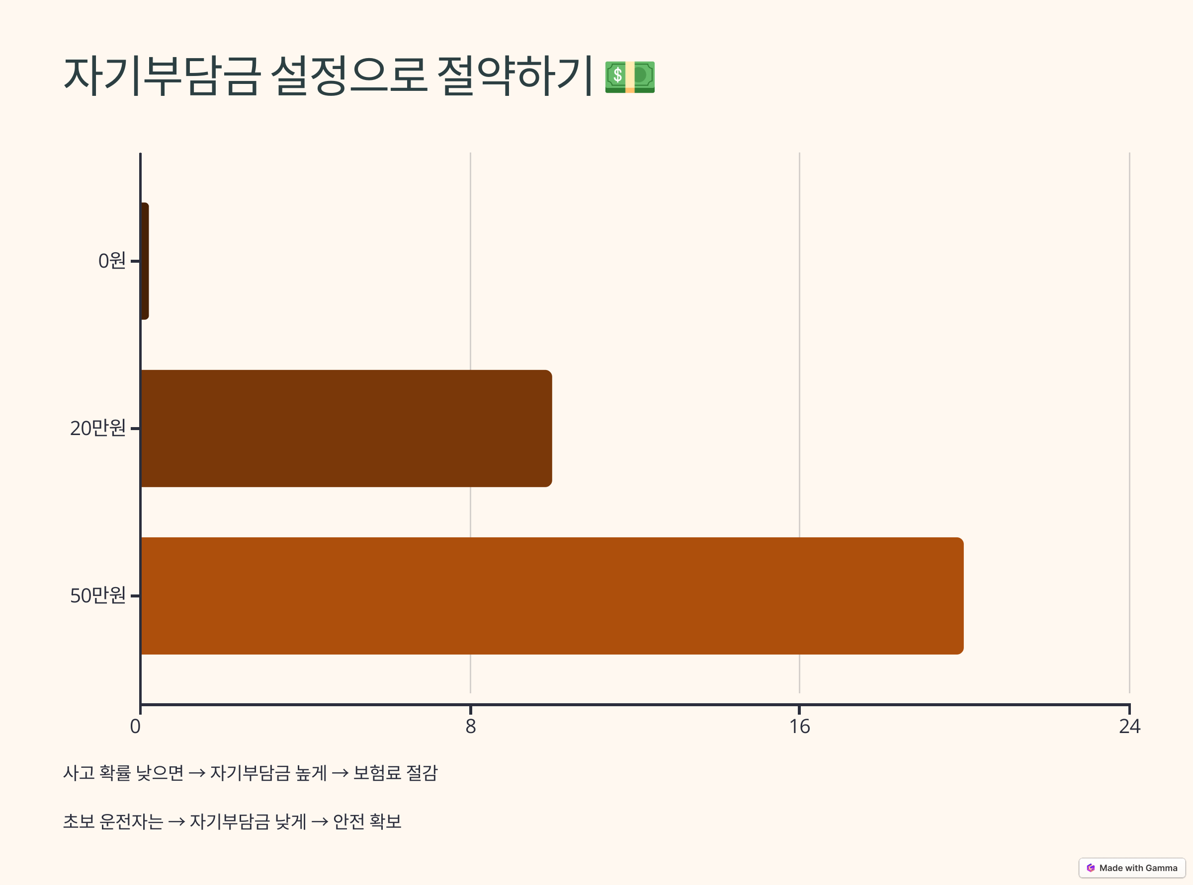 자기부담금 설정 TIP! ✔️ 사고 발생 확률이 낮다면 자기부담금을 50만원 이상으로 설정하여 보험료를 줄이는 것이 유리해요. ✔️ 반대로 초보 운전자라면 낮은 자기부담금으로 설정하는 것이 안전합니다.