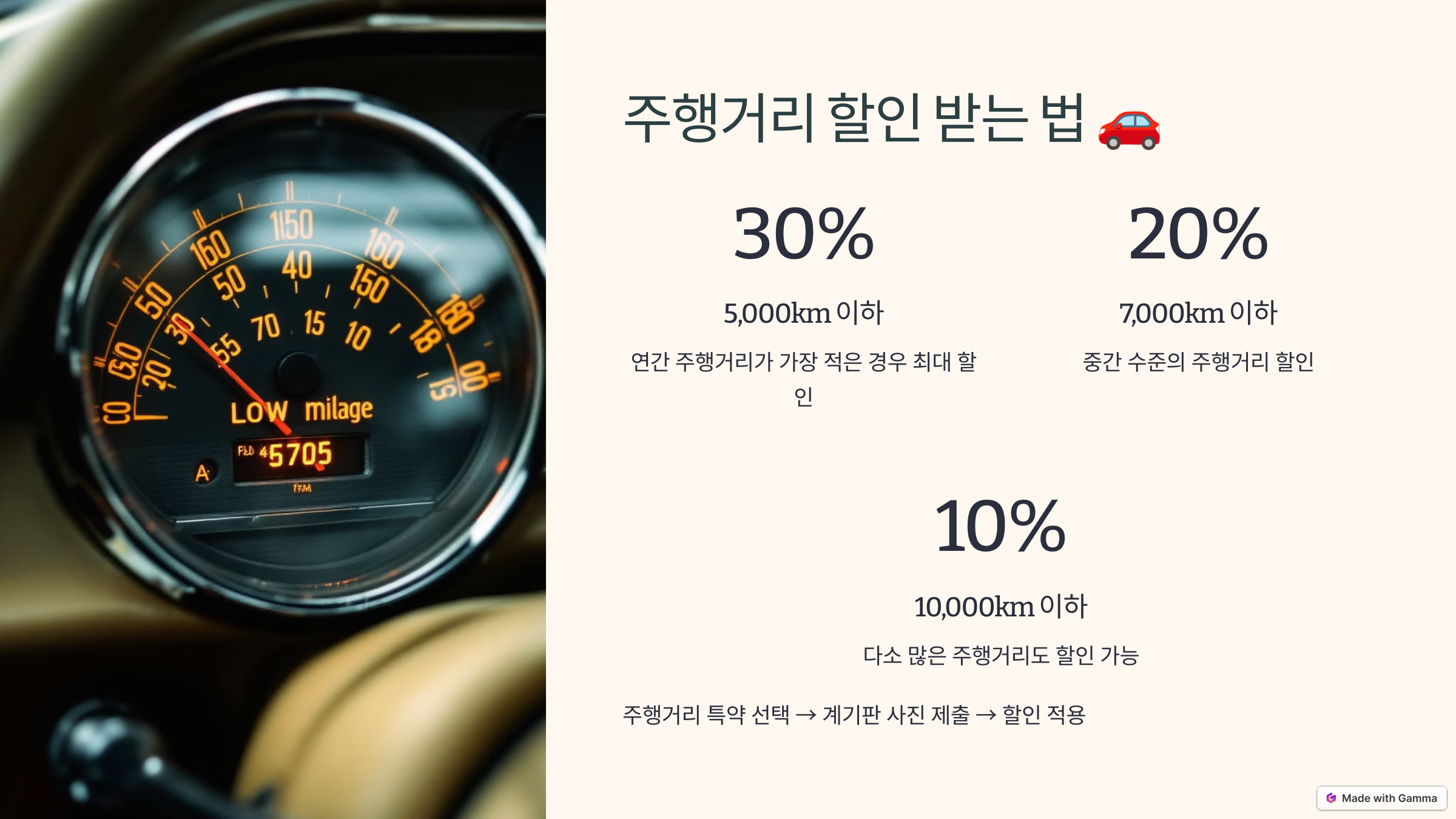 보험 가입 후 차량 계기판 사진을 제출하면, 연간 주행거리에 따라 최대 30%까지 보험료를 절약할 수 있어요. - 자동차 보험은 꼭 매년 갱신해야 하나요?