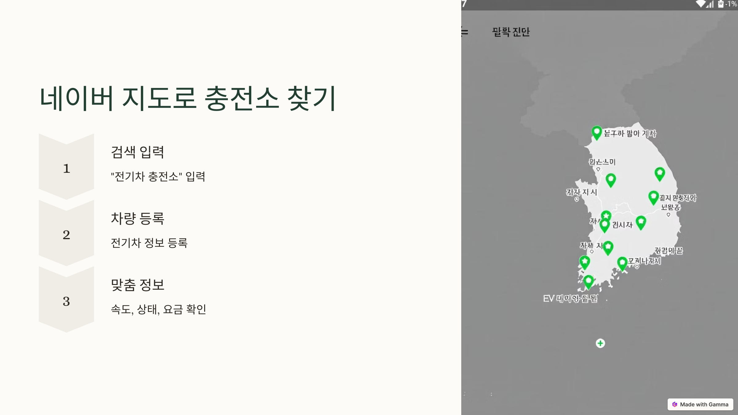 1️⃣ 네이버 지도 앱을 실행한 후, 검색창에 **"전기차 충전소"**를 입력하세요. 2️⃣ 차량 정보(전기차)를 등록하면, 맞춤형 충전소 정보를 제공해줘요. 3️⃣ 각 충전소의 **충전 속도, 사용 가능 상태, 이용 요금** 등을 확인할 수 있습니다.